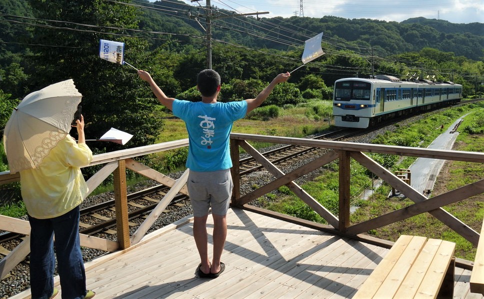 急行型電車に、手旗信号のように振るお父さん・・です。